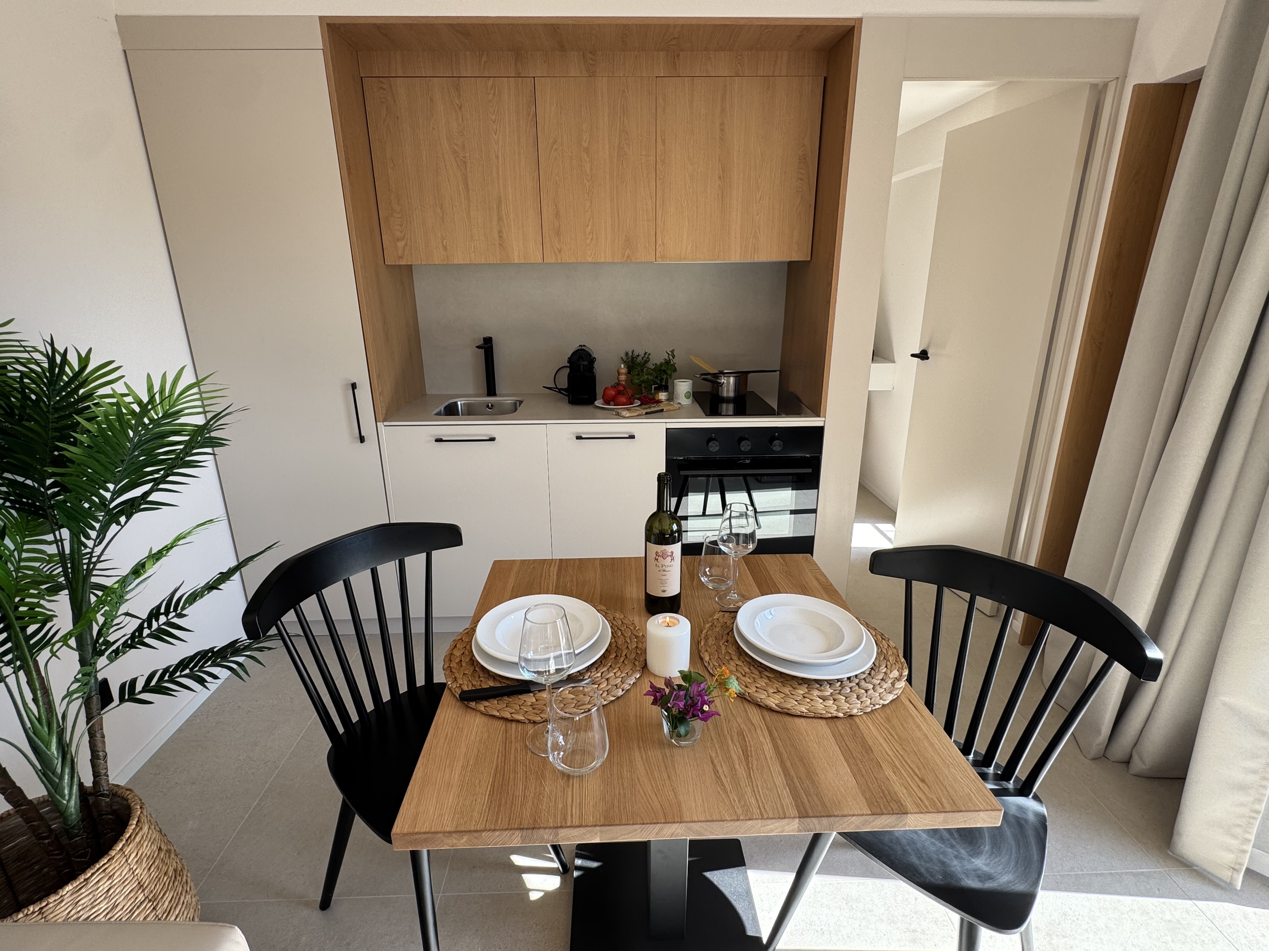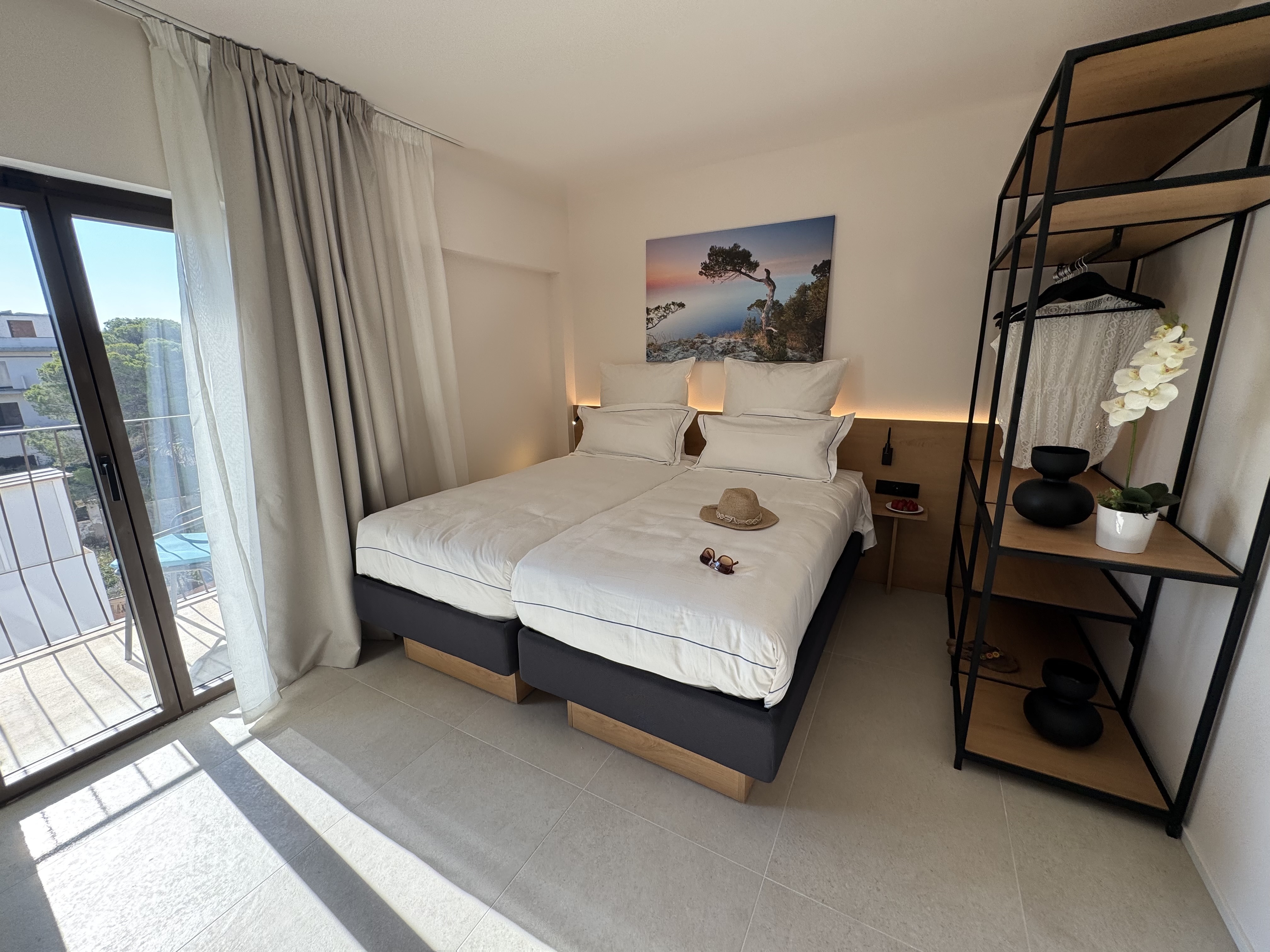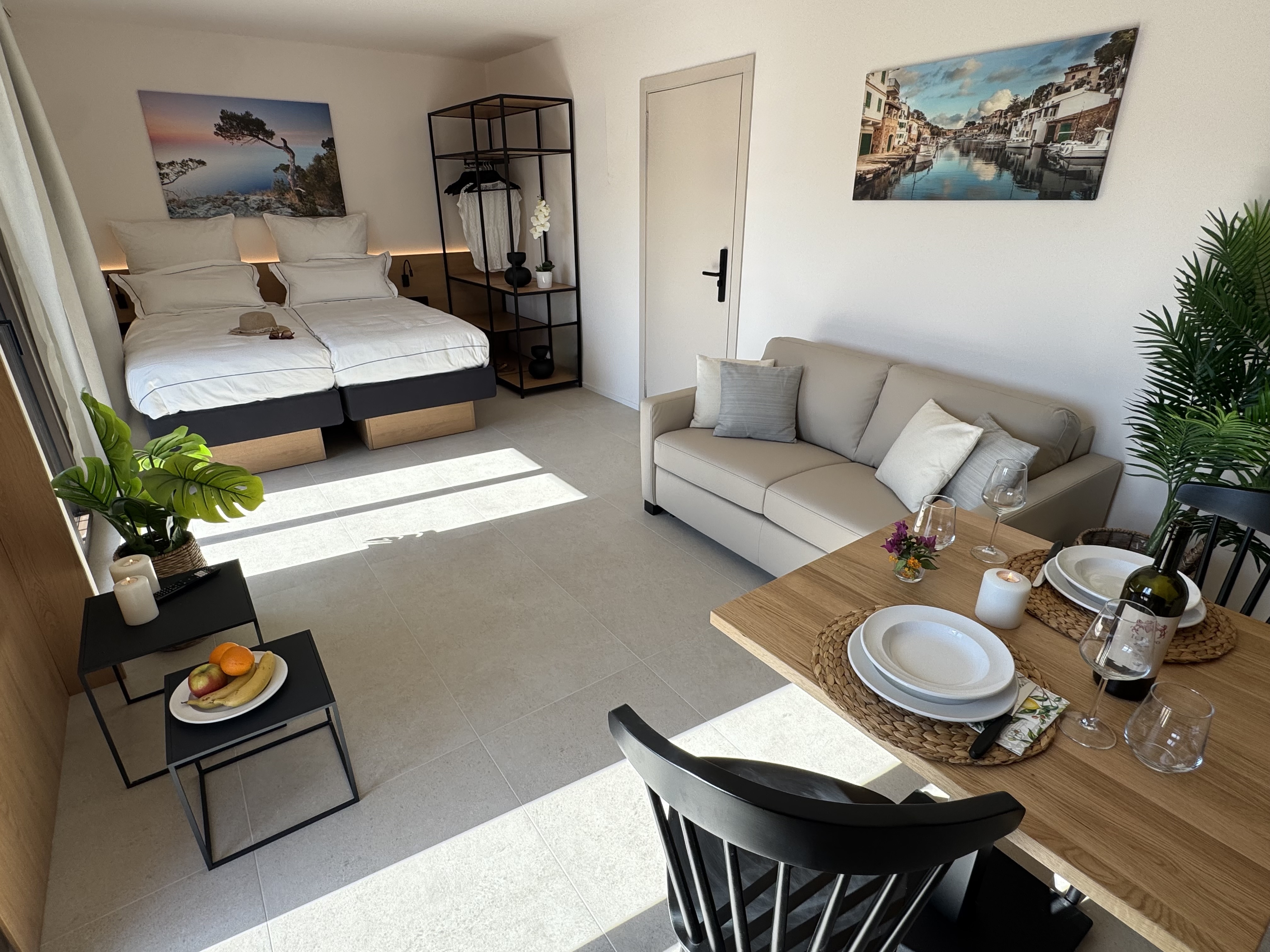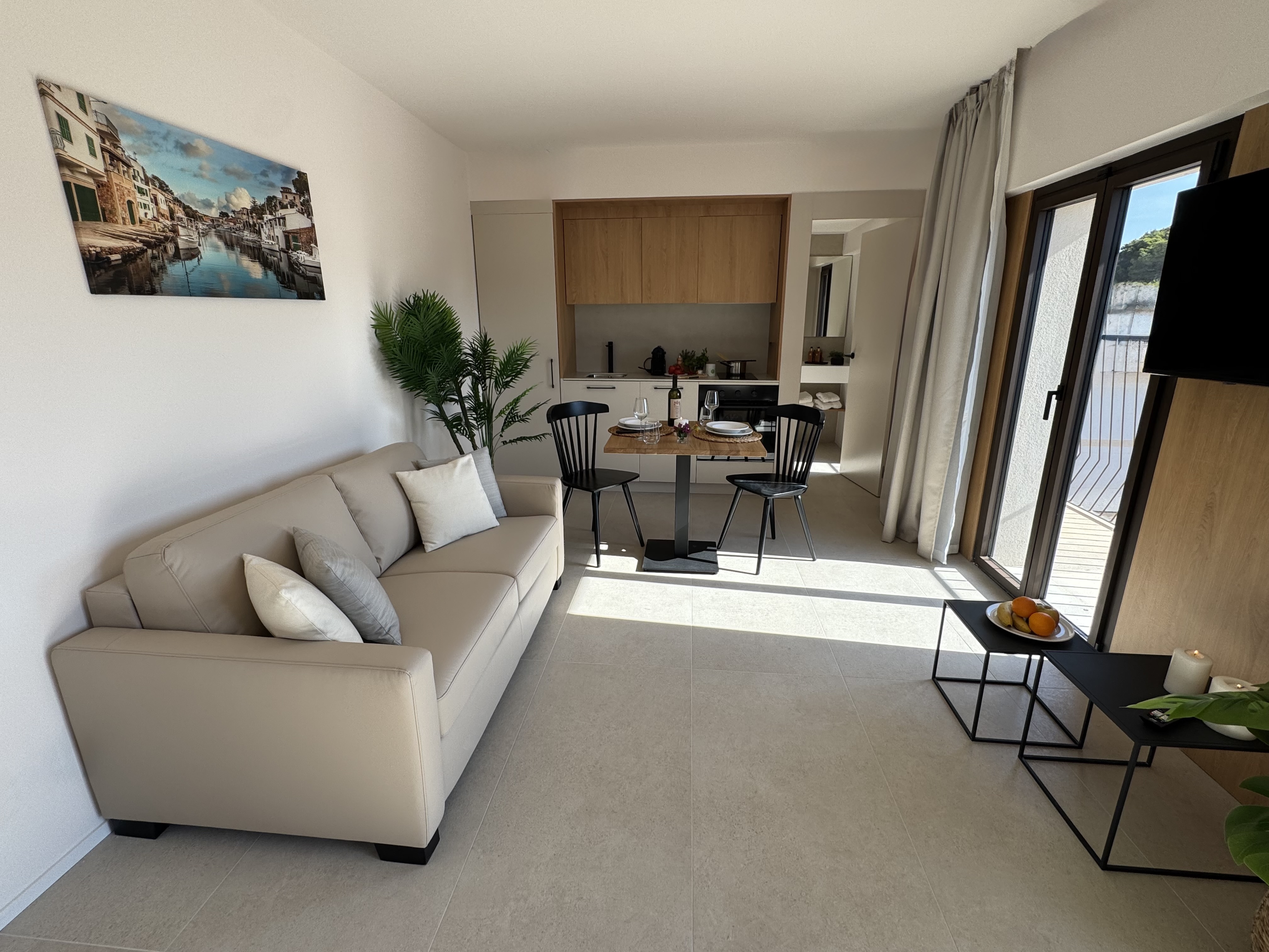 Spacious and elegant, our Master Suite offers a separate bedroom, a modern living area with kitchenette, and a private balcony. Ideal for longer stays or families seeking comfort, privacy, and the authentic Mediterranean lifestyle.